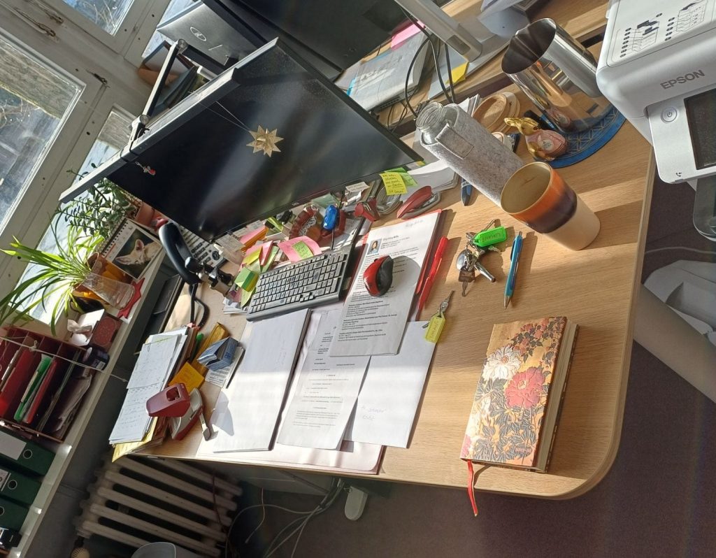 Der erste Kaffee ist getrunken, heißer Tee steht für den Tag bereit … ran ans Werk … am Ende des Tages verlasse ich meinen Schreibtisch wieder aufgeräumt leer …