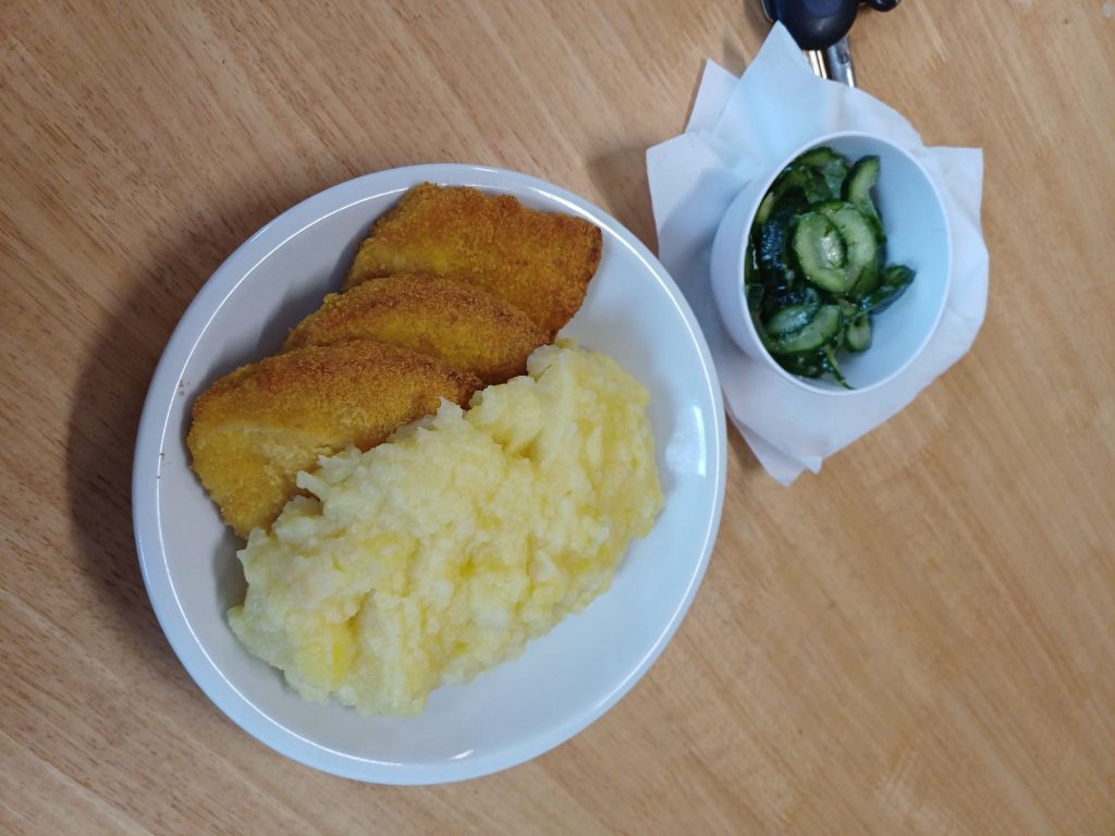 Auf unserem Bio-Schulessenplan steht heute vegetarisches Schnitzel mit Kartoffel-Sellerie-Stamp … lecker wars …