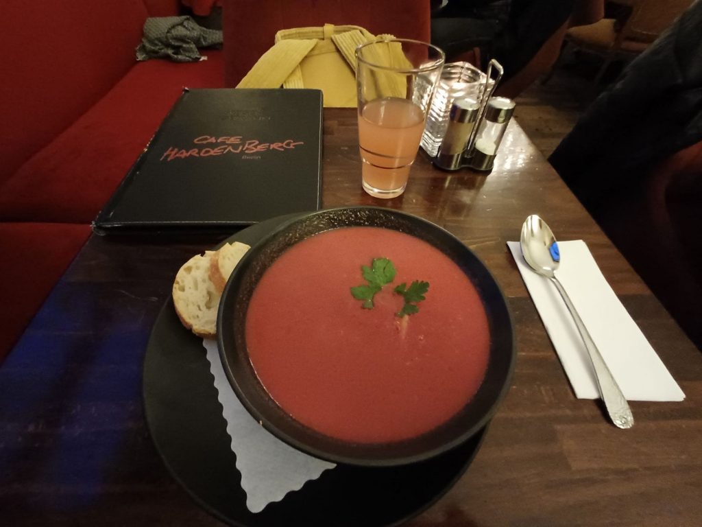 doch vor allem vom Essen bin ich hier begeistert … heute auf der Wochenkarte: Rote-Beete-Suppe mit krosser Apfeleinlage … zum Nachtisch bekomme ich das beste Schokoladen-Sufflee, was ich seit langem gegessen habe … sehr empfehlenswert!