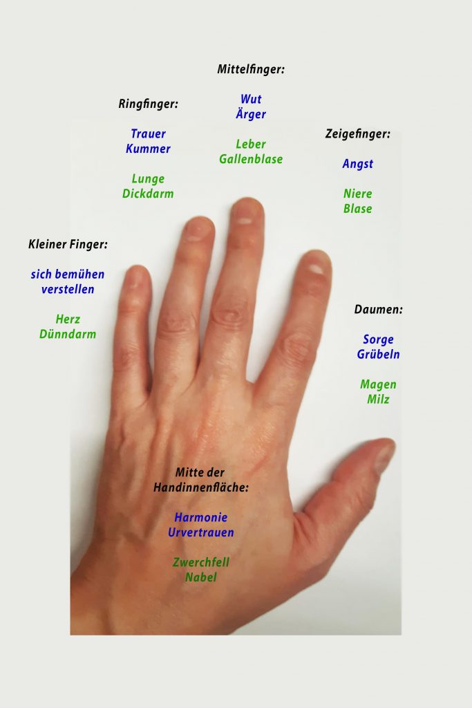 Im Jin Shin Jyutsu – der japanischen Heilströmkunst – sind alle Finger einem Gefühl zugeordnet, weil an diesen bestimme Meridianpunkte liegen.